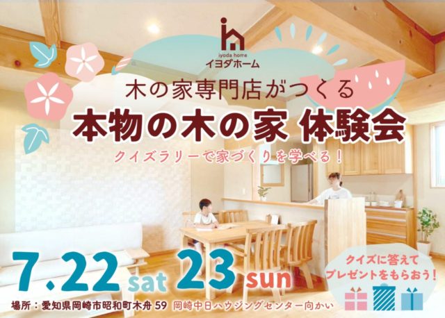お知らせ7月22日(土)23日(日)に「本物の木の家 体験会」を行います。なんとなく木の家がいいなあと思っている方、木の家が良い理由はハッキリ明確にあります!猛暑でもエアコン1台で家じゅう心地よい「本物の木の家」を体感しながらクイズラリーで楽しく家...